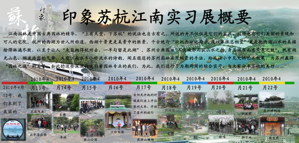 4月11日至23日,园林学院园林071、072班学生到苏州、杭州进行了为期两周的园林综合实习,对中国的古典园林和现代园林进行了参观学习。此次展出的作品均为学生在实习过程中创作和设计的。