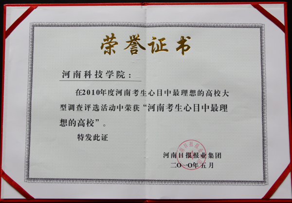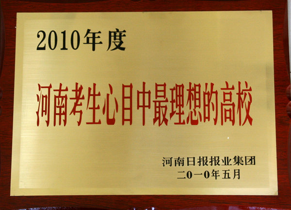 5月11日上午,由河南日报报业集团以“培养创新人才,办人民满意的教育”为主题举办的“河南教育高峰论坛暨2010年度河南考生心目中最理想的高校颁奖典礼”在郑州举行,我校被评为“2010年度河南考生心目中最理想的高校”,这是我校继去年荣获“河南最具公信力的十大教育品牌”之后的又一殊荣。