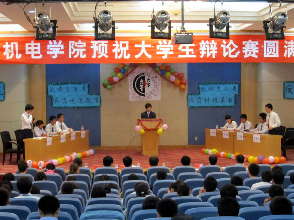 为进一步宣传低碳生活理念,培养学生的团队合作精神,提高大学生的语言表达能力和思辨能力,机电学院于5月7日晚在图书馆二楼报告厅举办了一场辩题为“低碳生活更依靠观念改变还是科技革新”的辩论赛。校党委宣传部副部长赵长春,校学生处副处长巴新华、杨宾峰,机电学院党总支副书记张玉新,数学系教师马宝林和校团委袁博老师担任评委。机电学院300余名同学观看了辩论赛。
