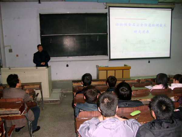 王自良教授凭借多年来在动物性食品安全生物技术方面的研究,站在动物源性食品安全研究领域的前沿,向同学们详细介绍了动物性食品安全快速检测技术的最新研究进展。