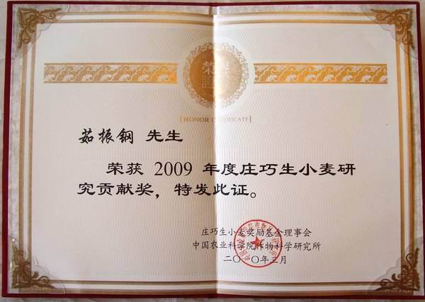 茹振钢教授获2009年度“庄巧生小麦研究贡献奖”