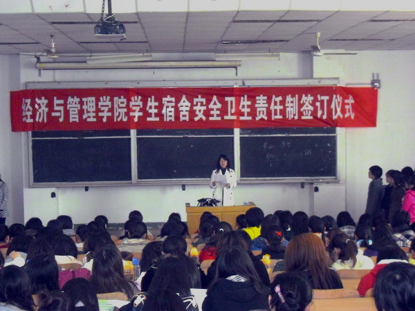 为营造温馨、舒适、安全、整洁的学生宿舍环境,经济与管理学院在全体学生中实行了宿舍卫生安全责任制度。3月16日,学院在电教综合楼的四个合教室举行了宿舍安全卫生责任制签订仪式,学院党总支副书记陈松玲、全体辅导员及1400余名学生参加了签字仪式。