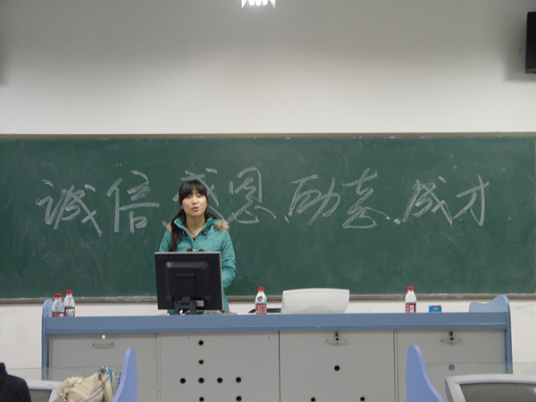 外语系09年度国家奖金获得者06级学生宾孟,助学金获得者06级学生乔良文、孙莲阁、沙静等四位同学结合自己大学四年学习、生活经历,从诚信做人、学会感恩、砥砺志向、全面发展等几个方面做了报告。