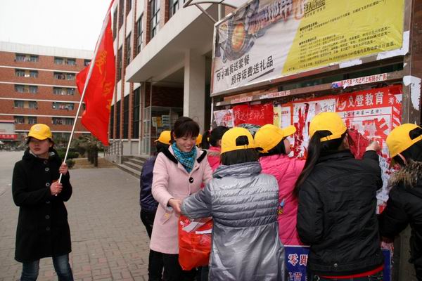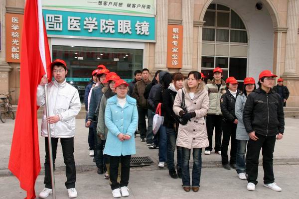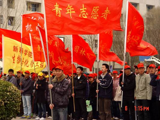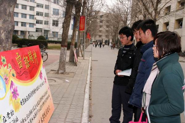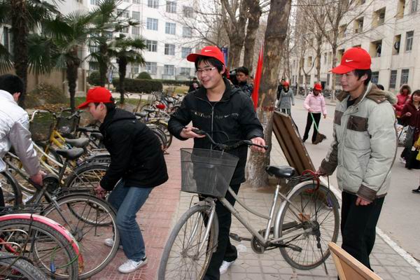 3月5日中午,来自各院(系)的几百名青年志愿者放弃休息时间,冒着风雪开展了包括清理小广告、打扫卫生、摆放自行车为主要内容的志愿服务。在公告栏前、草坪间、操场上,在教学楼、实验楼、行政楼前,在校园卫生区、家属区内,处处活跃着志愿者们的身影,流动的小红帽构成了校园中一道靓丽的风景。在校门口5路公交车站前,志愿者们有礼貌地维持着上下车秩序,扶提帮托,一个笑容,一句话语,为乘客们送去春天般的温暖。在这个志愿者的节日里,志愿者们用实际行动弘扬和践行着雷锋精神和志愿者精神。