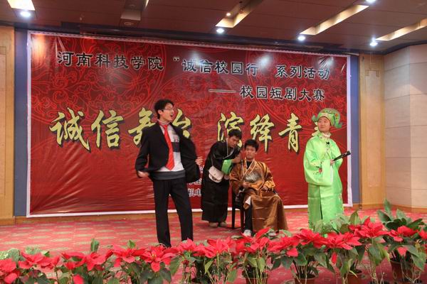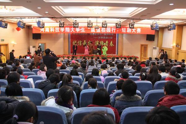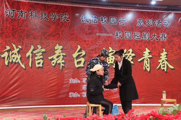2009年12月31日晚,由校学生处、学生资助管理中心主办,机电学院承办的我校大学生“诚信校园行”短剧大赛决赛在图书馆二楼报告厅举行。校党委组织部副部长余鹏,校党委宣传部副部长赵长春,校学生处副处长巴新华、杨宾峰,校团委副书记云鹏、校学生资助管理中心主任曹绍清以及人文学院陈丽湘、艺术学院何甲麒等老师担任大赛评委。学校300余名师生观看了比赛。