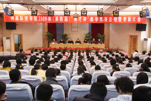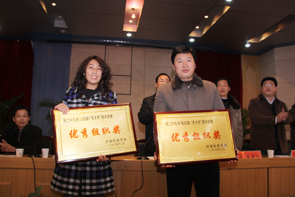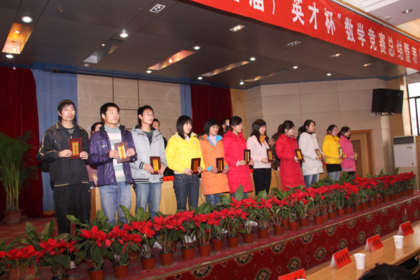 12月7日下午,我校2009年(第四届)“英才杯”数学竞赛总结暨表彰大会在图书馆二楼报告厅举行,副校长王文鹏、窦玉玺出席会议,校团委、学生处、教务处、教学督促组老专家、各院系副书记、辅导员及300余名学生参加表彰会。