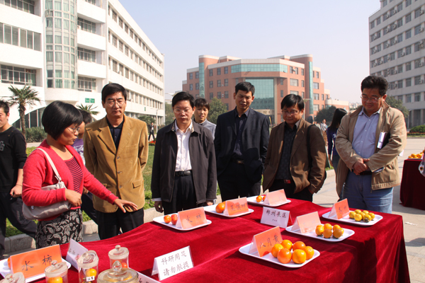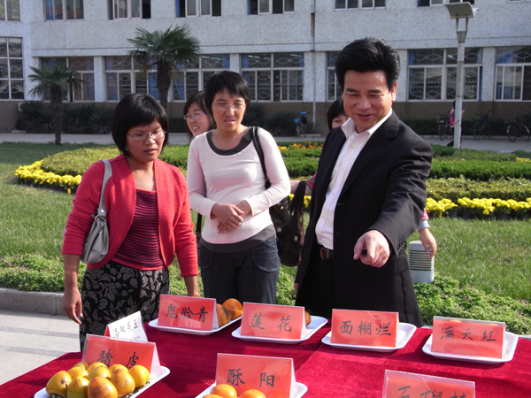 日前,由园林学院“柿资源与利用”课题组主办的“河南省柿属植物种质资源展”在我校电教综合楼前致远广场举行。展览以”金柿映秋贺校庆”为主题,分区展示了河南省新乡、郑州、洛阳、安阳、南阳、焦作6个地区100余份柿属植物种质资源。展览得到我校各级领导的关心支持,校党委书记严全治在百忙中亲临展会现场,对课题组的科研工作给予了充分肯定,校党委副书记郭海波、副校长刘兴友参观展览后,欣然题字“挖掘柿子资源,加强产品开发”,给今后的研究指明了方向。展览还引起了广大师生的广泛关注,使人们对柿及柿产品有了更全面的认识和了解。(园林学院 扈惠灵)