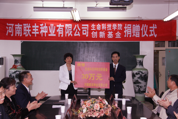 河南联丰种业有限公司为民营企业,以崇文重教,真诚与院校和科研单位合作,以回馈社会的理念铸造了公司的良好形象和社会声誉。在我校60周年校庆之际,河南联丰种业有限公司创新基金的捐赠不仅是对生命科技学院办学的巨大支持,也是对我校60岁生日的一份厚礼!(生命科技学院 )