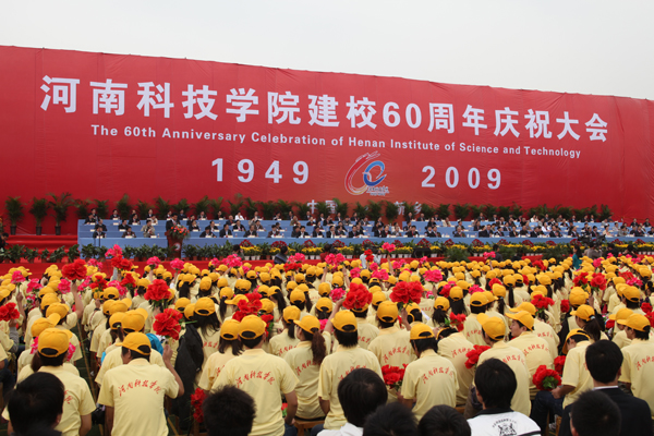 河南科技学院始建于1949年。60年来,学校三迁其址,六易其名,从平原省立农业学校和北京农业大学长治分校到平原农学院,再到百泉农业专科学校、河南职业技术师范学院、河南科技学院, 60载奋斗历程中,践行大学理念,履行人才培养、科学研究、社会服务的大学职能,传播现代科学文明,书写出我国高等农业教育和高等职业技术师范教育的绚丽篇章,在中国高等农业教育和高等职业技术师范教育史上留下了一道浓彩。60年来,河南科技学院的发展伴随着共和国跳动的脉搏,始终与国家同呼吸,与民族共命运。在她的身上,流淌着中华民族艰苦奋斗、自强不息的精神血脉,回荡着几代河南科技学院学人和校友推动国家经济发展、民族振兴、社会进步的铿锵足音。校庆期间,中共河南省委书记、省人大常委会主任徐光春同志为我校题词:“科技创新,服务三农”;中国教育发展基金会理事长、原教育部副部长张保庆同志、省政协主席王全书同志也欣然为我校校庆题词。