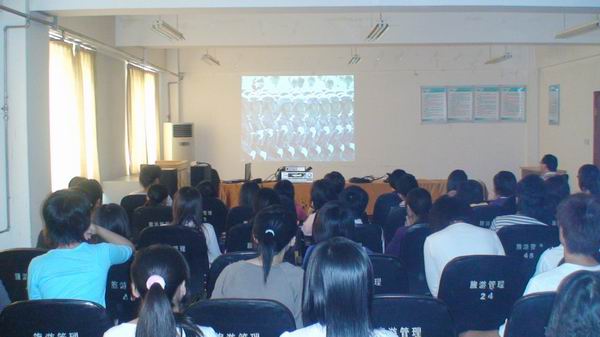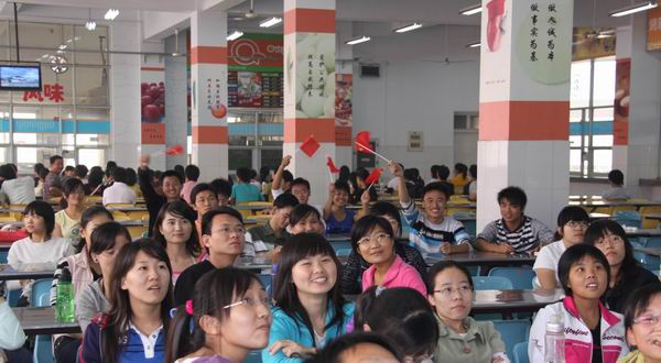 在食品学院办公楼四楼旅管实验室内,气氛热烈,百余名同学目不转睛地观看国庆庆典的每一个细节,不时迸发出阵阵欢呼,不约而同地喊出“团结奋进,振兴中华,祖国万岁!”的口号。当看到各界群众身着节日盛装,为新中国的生日载歌载舞,展示新中国60年辉煌成就的彩车缓缓驶来时,同学们激动得热泪盈眶,为祖国的繁荣昌盛而自豪,热烈的掌声和欢呼声一浪搞过一浪。