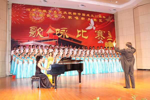 8月30日下午,“欢乐中原”——河南省教育系统庆祝新中国成立60周年爱国歌曲大家唱歌咏比赛(新乡赛区)在河南师范大学音乐厅隆重举行,来自豫北地区的十余所高校参加了比赛。经过2个多小时的精彩比赛,最终我校代表队凭借在《太阳最红,毛主席最亲》、《远方的客人请你留下来》两首参赛歌曲中的出色表现摘得本次比赛的银奖。