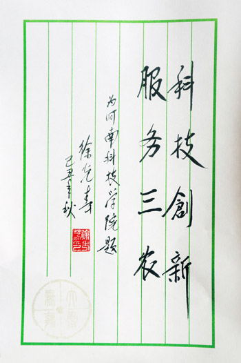 日前,省委书记、省人大常委会主任徐光春为我校欣然题词:“科技创新,服务三农”。