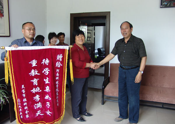 5月18日上午,高职学院学生张妍妍的妈妈早早地就赶到了学院,将一面绣有“待学生亲如子女,重教育桃李满天”的锦旗送到了学院党总支书记项继堂手中。张妈妈久久地握着项书记的手,眼中闪现着泪花,“谢谢了,谢谢了,多亏了咱学校啊……要不,俺恐怕就再也见不到孩子了……”。项书记对张妈妈亲切地说:“您把孩子送到学校,是对我们的充分信任,放心吧,学校会像对自己孩子一样去关爱他们”。