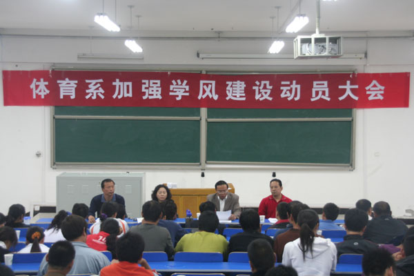 为进一步实践科学发展观,推动教风学风建设,5月14日下午,体育系在8号楼合一教室召开学风建设动员大会。体育系全体教师和在校学生共200余人参加了大会。大会由体育系副主任乐玉忠主持。