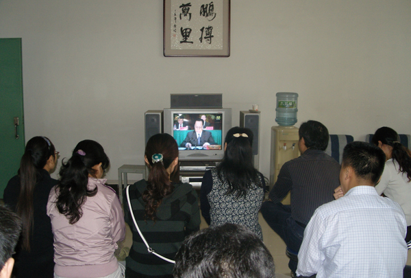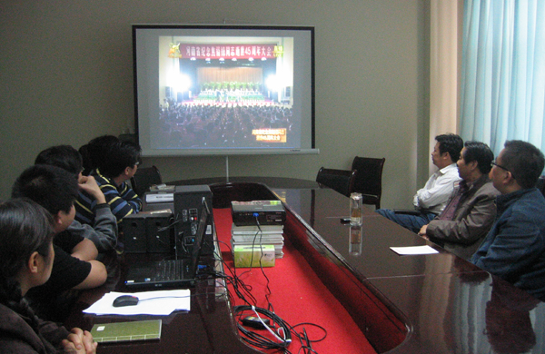 校党政领导和第一党总支部分干部认真收看大会实况(图二)