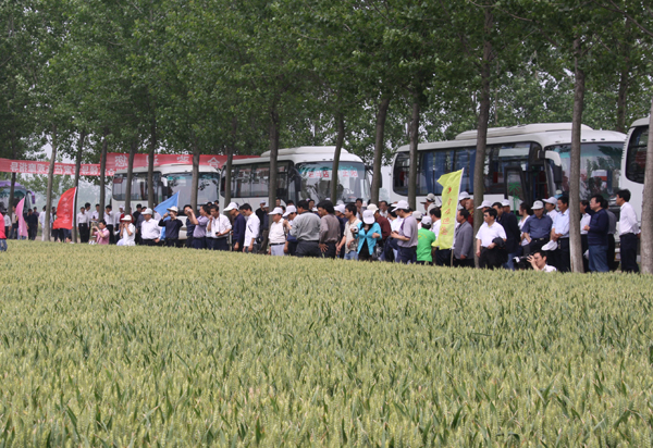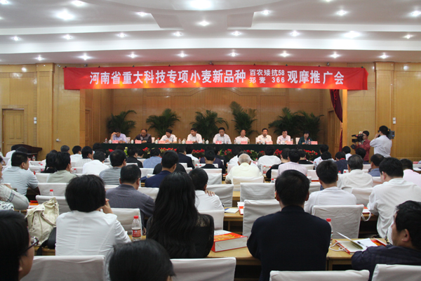 省科技厅厅长赵琛,农业厅总农艺师夏长安,省农业科学院院长马万杰,国家小麦工程技术中心教授郭天财等领导、专家,全省各地市科技局领导、专家,各地种子企业经理等近400人,面对丰收在望的“百农矮抗58”,一片赞叹。国家小麦工程技术研究中心副主任郭天财教授说:“由省重大科技专项支持的两个小麦新品种‘百农矮抗58’、‘郑麦366’,均表现出了非常好的抗旱、抗寒特性。”“郑麦366”示范方的平均亩产在550公斤左右,其中高产攻关亩产可望达600公斤以上。