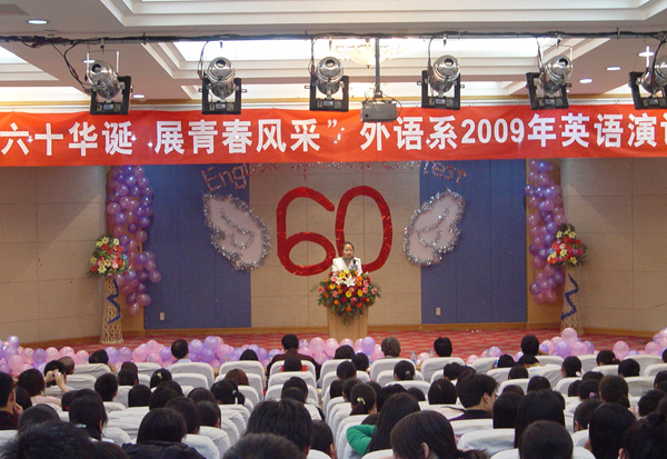 为庆祝建国、建校60周年,锻炼提高大学生的英语口语表达能力,激发广大学生以努力学习为校庆献礼的热情,展现新时期大学生青春靓丽的风采,外语系于5月10日晚在图书馆二楼报告厅举办了“庆六十华诞、展青春风采”英语演讲比赛。