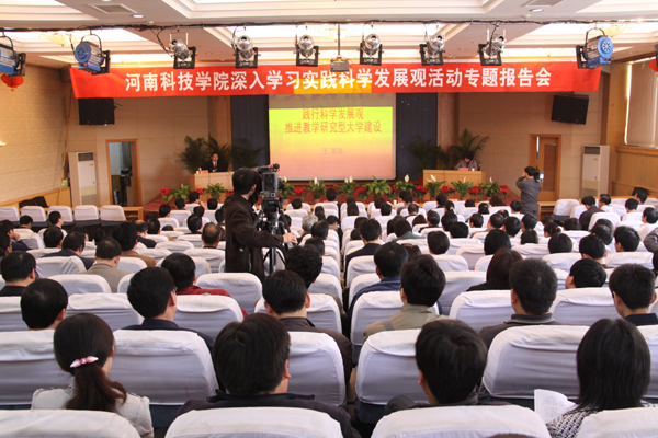 4月20日下午,我校深入学习实践科学发展观活动专题报告会在图书馆二楼报告厅举行。校长王清连作专题辅导报告。在校的学校党政领导、处级干部、高级职称人员、博士、机关科级干部等300余人参加了报告会。