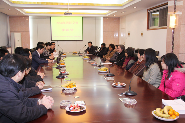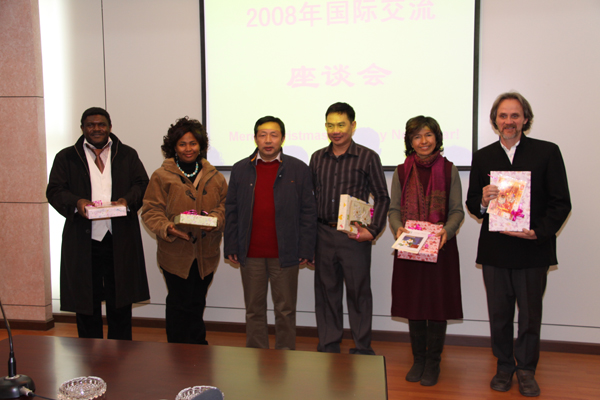 12月24日下午,我校在综合电教楼八楼第二会议室召开了2008年国际交流座谈会。校长王清连教授、副校长刘兴友教授、校长助理李敬玺教授、校长助理赵一鹏教授出席座谈会,校长办公室、人事处、教务处等部门负责同志以及外籍教师、归国人员代表、拟出国人员代表、学生代表共20余人参加座谈会。座谈会由国际交流处处长赵瑞香教授主持。