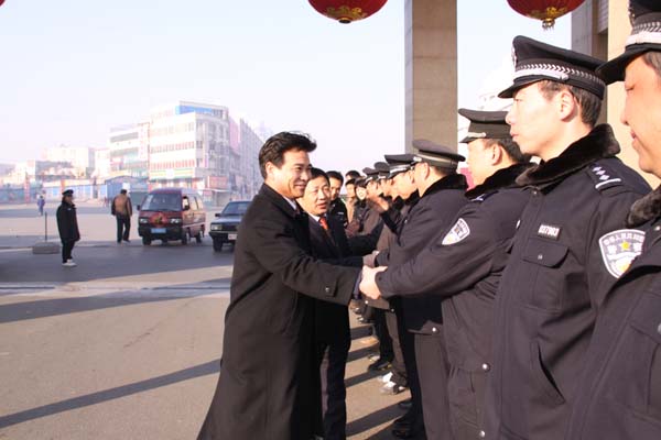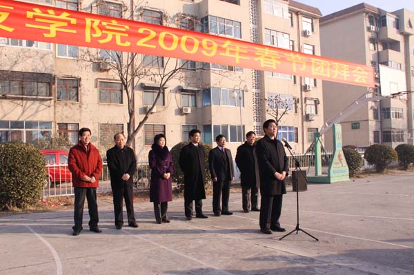 1月26日(农历正月初一)上午9:00,我校2009年春节团拜会在西篮球场举行。在校的党政领导严全治、王清连、张玉珍、梁赖、窦玉玺、张民校、郭海山与广大教职工互祝节日问候,共贺新春佳节。团拜会由副校长梁赖主持。