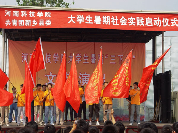 7月16日上午,我校“2008大学生暑期‘三下乡’社会实践启动仪式”在新乡市新乡县七里营镇政府前广场举行。