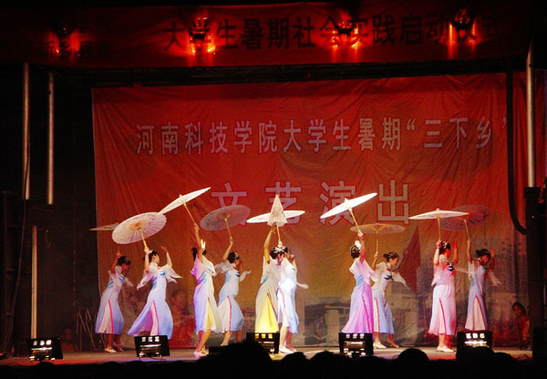7月16日晚,我校“心连心”艺术团赴七里营镇三下乡文艺演出在该镇文化广场举行。演出前,新乡县委常委、七里营镇党委书记梁常运致欢迎辞,对大学生“心连心”艺术团的到来表示欢迎和感谢,并预祝演出成功。节目在王岩老师《节日欢歌》的歌声中拉开帷幕。在乡亲们热情的掌声中,我校“心连心”艺术团成员先后演唱了《乡音乡情》、《北国之春》、《咱老百姓》等多首歌曲,表演了器乐联奏《扬鞭催马运粮忙》、《梅花三弄》、《月光下的凤尾竹》,省大学生科技文化艺术节获奖舞蹈《山路弯弯》、《邵多丽》和《小城雨巷》及杂技《柔术表演》、健美操《青春节拍》等十余个节目。使当地广大群众获取了一场优美的视觉和听觉享受。晚会最后在《和谐中国》的歌声中落下帷幕。(校团委)