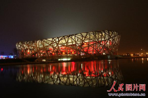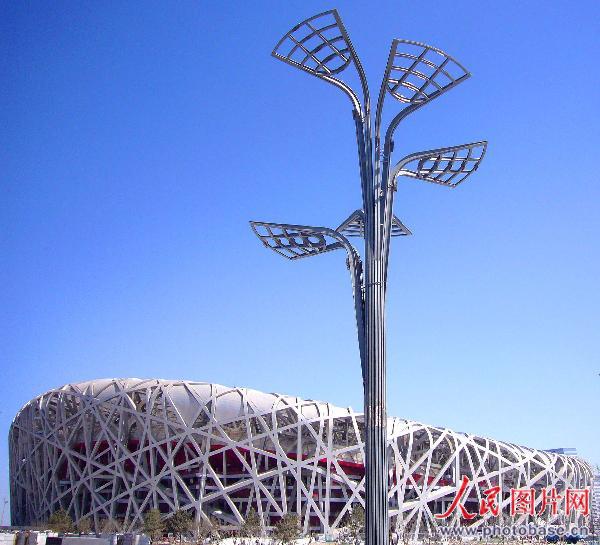 3月13日,北京碧天如洗、阳光灿烂。“鸟巢”广场外景灯的施工正在加紧进行,新颖独特的主体灯架已初露芳姿, 在蓝天的映衬下显得格外美丽。