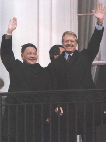 (图为邓小平和美国总统卡特在白宫阳台上。)
