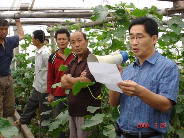5月29日,由我校园林学院姚莲芳教授主持的河南省农业结构调整项目“双万亩蔬菜产业化生产示范基地建设”子项目“春季大棚黄瓜新品种引进”现场会在新乡市牧野乡无公害蔬菜生产基地举行。河南省农科院、河南农业大学、新乡市农业局等单位的专家领导和天津德瑞特种业有限公司、中国农科院蔬菜花卉研究所等黄瓜育种单位代表及当地群众代表200多人参加现场会。现场会上,项目组成员分别介绍了32个参试黄瓜品种的早熟性、丰产性和抗病性等方面的栽培表现,并引导与会人员详细察看了各黄瓜品种的田间生长情况。现场会使广大菜农群众对国内最新的黄瓜品种有了更深的了解,为明年黄瓜新品种的引种和增产增收奠定了良好基础。(园林学院)