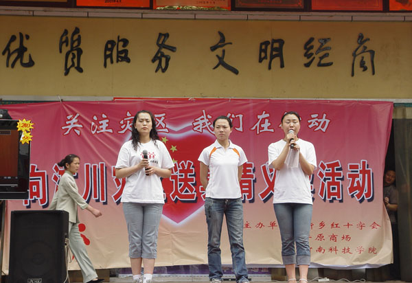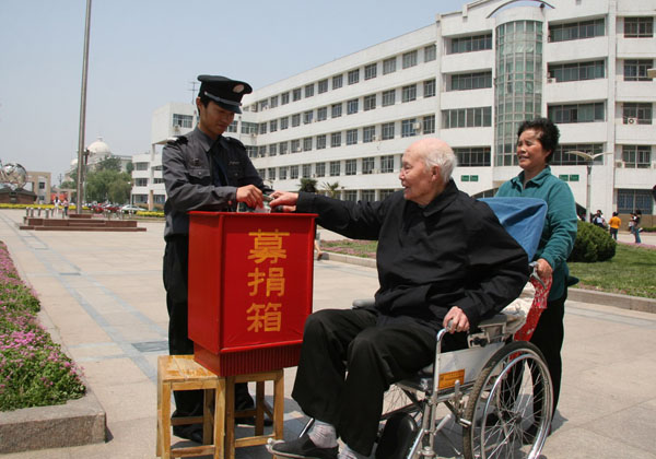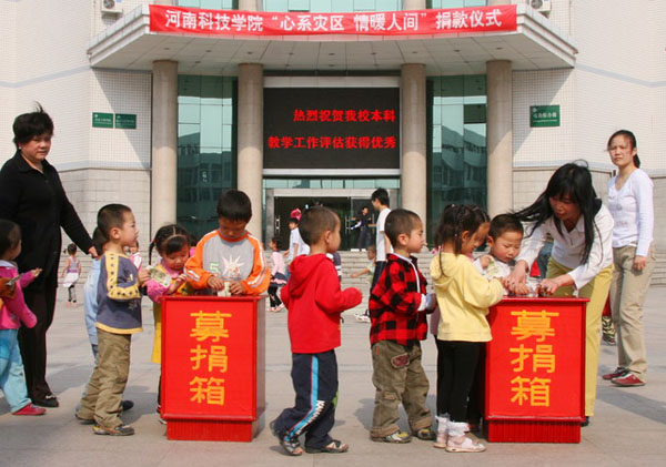 5月14日,自我校党委、行政的组织号召下开展捐款活动以来,全校师生纷纷伸出了援助之手,尽己所能为灾区人民奉献爱心,一场情系灾区人民的爱心接力活动正在校园的每个角落开展着。几天来,严全治、王清连等全体校领导带头捐款,全校师生员工积极响应,慷慨解囊;校学生会向全校学生发出赈灾倡议,青年志愿者协会利用课余时间参加新乡市募捐活动,机电学院机教042班的全体同学连夜折了1001个纸鹤表达祝福平安的心愿;身在美国的动科学院的袁慧君博士,及时联系家人,代她捐款500元,离退处的张声耀老教授坐着轮椅,由家人推着亲自把200元钱放进捐款箱;幼儿园的小朋友们也抱出自己的存钱罐……