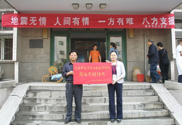 截止5月16日下午6时,河南科技学院全校师生共为地震灾区捐款178131.67元。5月17日上午,在校工会主席郭海山的带领下,校团委和校学生会的代表一起把满含全校师生对灾区人民情谊的捐款全部交到了新乡市红十字协会。