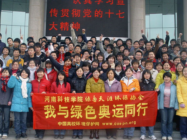 为迎接2008北京奥运会,资源与环境学院“绿遍天涯”环保协会于12月21日上午在主楼前举办了“我与绿色奥运同行”活动。