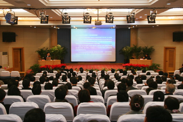 11月29日下午,我校在图书馆二楼报告厅召开学习贯彻党的十七大精神专题报告会,党委书记严全治应邀作了题为《贯彻落实科学发展观 全面推进学校事业又好又快发展》的首场报告。党委副书记张玉珍主持报告会。在校的党政领导梁赖、王文鹏、张民校和全体处级干部、教授、博士及机关科级以上干部等350余人参加报告会。