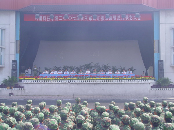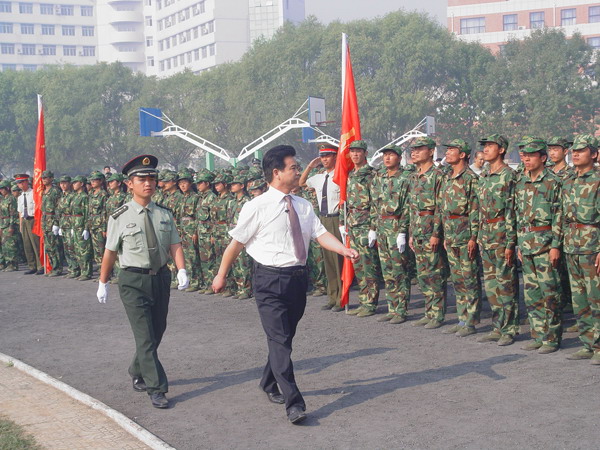9月21日上午,我校在西操场召开2007级新生军训汇报表演暨总结表彰大会。校党政领导严全治、张玉珍、梁赖、王文鹏、窦玉玺、张民校、郭海山及71697 部队首长谢天平、赵凯营等出席大会,学校主要职能部门负责人以及各院(系)党总支书记、帮训教官和受训新生等5000余人参加大会。大会由校长办公室主任陈自录主持。