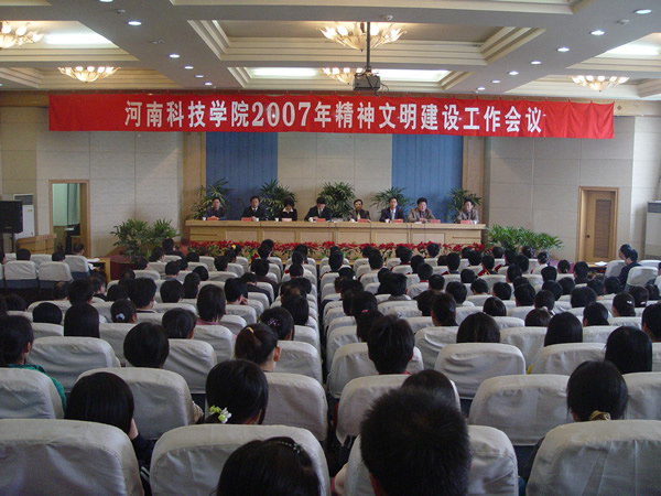 4月12日下午,我校在图书馆二楼报告厅隆重召开2007年精神文明建设工作会议。校党政领导严全治、齐毅、张玉珍、郭海波、王清连、梁赖、刘兴友、郭海山等出席会议,各单位党政主要负责人、各院系副书记、辅导员、教师代表、学生代表300余人参加会议。会议由校党委副书记齐毅主持。