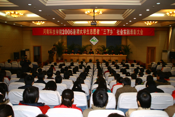 1月11日,我校在图书馆报告厅召开2006暑期“三下乡”社会实践表彰大会,校党政领导严全治、齐毅、张玉珍、郭海波、王清连、王文鹏、刘兴友、张民校、郭海山等出席会议,校大学生社会实践活动领导小组全体成员、各院系相关负责人、团干教师、受表彰人员、学生代表等300余人参加会议。