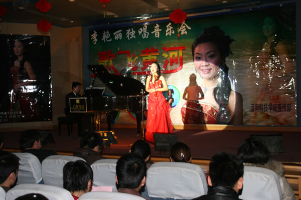 12月29日晚,由校党委宣传部主办的李艳丽《歌飞黄河》独唱音乐会在图教201教室举行。校纪委书记张民校、有关部门负责人及师生500余人观看了音乐会。在近一个半小时的时间里,李艳丽老师为大家倾情奉献了《茉莉花》、《母亲河》、《在中国大地上》等10多首脍炙人口的民族歌曲,充分展示了她扎实的基本功底和对歌曲所蕴含情感的理解,她甜美的嗓音、丰富的表情、深厚的情感、精彩的演唱给全体观众带来了美的音乐享受和2007年新年的祝福。广大观众也用一阵阵的热烈掌声表达了对演唱者的深深谢意。