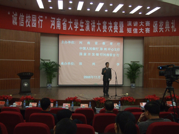 11月22日,“诚信校园行”河南省大学生演讲大赛在郑州大学管理中心第一报告厅落下帷幕,此次大赛由河南省教育厅、中国人民银行郑州中心支行、国家开发银行河南分行主办,郑州大学承办。河南省人大常委会副主任贾连朝、河南省教育厅厅长蒋笃运、中国人民银行郑州支行、国家开发银行河南分行负责人等有关领导观看了比赛,并为获奖选手颁奖。