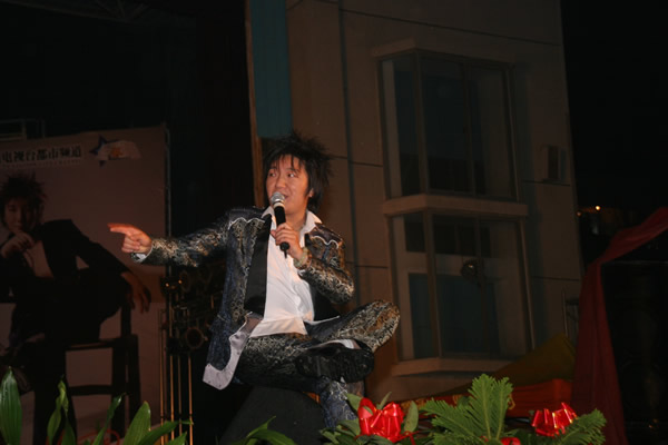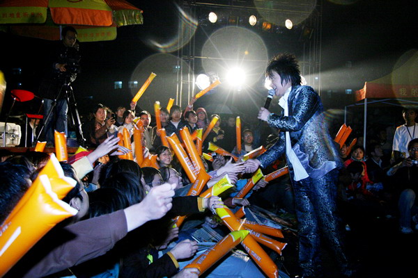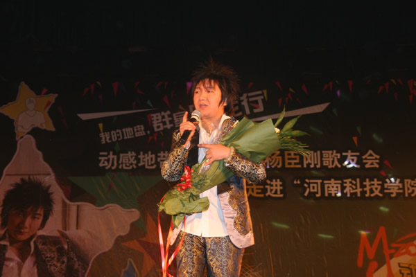 来自郑州街舞队一段活力四射的街舞迎出了都市频道星登陆主持人程杰,并以此拉开了歌友会序幕。我校学生付强和校大学生舞蹈队分别登台献艺,为歌友会助威,一曲优美的《风往北吹》和一段婀娜多姿的印度舞蹈《阿拉伯之夜》,赢得了台下观众的一片叫好声。7时40分,当身着深色印花舞台服的杨臣刚健步登上四周喷出条条银色焰火的舞台时,台下顿时爆发出热烈的欢呼声。“从前老鼠爱大米,现在老鼠爱玉米,超级女声也来到了这个世纪……”,伴随着秉承了《老鼠爱大米》曲风的歌曲《老鼠爱玉米》,歌迷和观众们拿着手中的荧光棒,随着音乐节拍欢乐挥舞,现场变成了“沸腾”的海洋。随后,杨臣刚冒着细雨激情的演唱了《老公PK老婆》等几首最新的主打歌曲,激情的演唱深深感染了所有观众的心。此间,2005年度河南“十大超男”杨玉涛进行了客串表演,杨臣刚与主持人程杰等还演出了一场滑稽的搞笑剧,并当场表演现场创作歌曲的能力,他的幽默、他的才华深深折服了每一个到场的观众。最后,他一边深情的演唱着《保重身体》,一边走下舞台与歌迷和观众进行握手道别,并在万余名歌迷与观众恋恋不舍的目光中飘然离去。(宣传部 孙震寰)