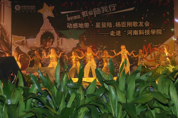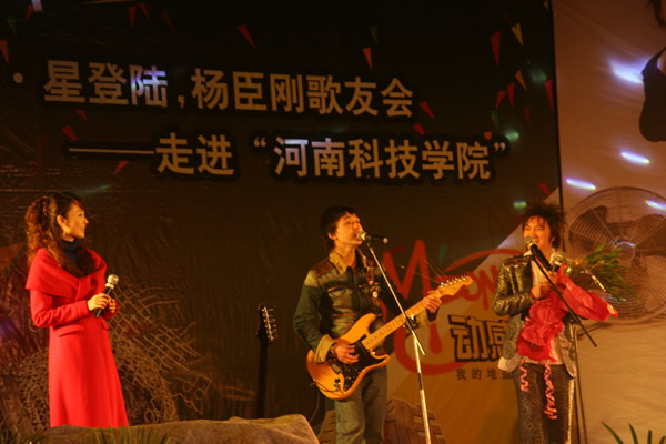 11月18日晚,天空飘着细雨,我校西操场依然变成欢乐的海洋。由河南电视台都市频道星登陆栏目、中国移动通信有限责任公司新乡分公司和我校联合举办的“我的地盘,群星随我行——动感地带、星登陆,杨臣刚歌友会走进河南科技学院”在此隆重上演。新乡各大高校师生及观众万余人观看了歌友会。