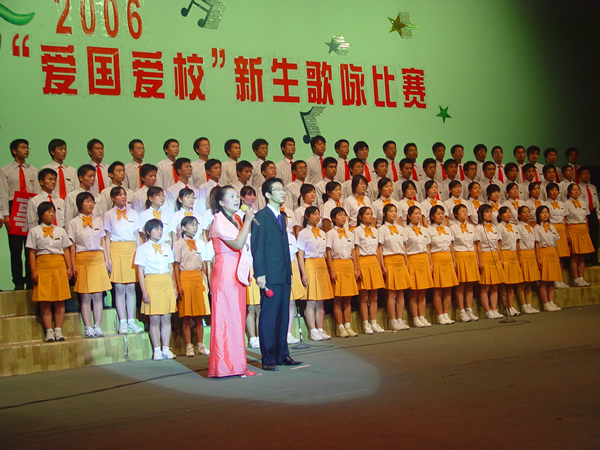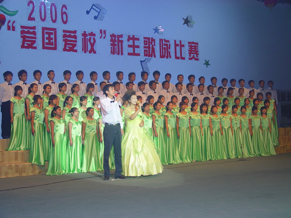 10月18日晚7:00,我校2006年 “爱国爱校”新生歌咏比赛在西操场大舞台拉开帷幕,省德育工作评估专家组成员和我校党政领导严全治、郭海波、王清连、梁赖、王文鹏、张民校、郭海山等及师生代表共5000余人观看了比赛。