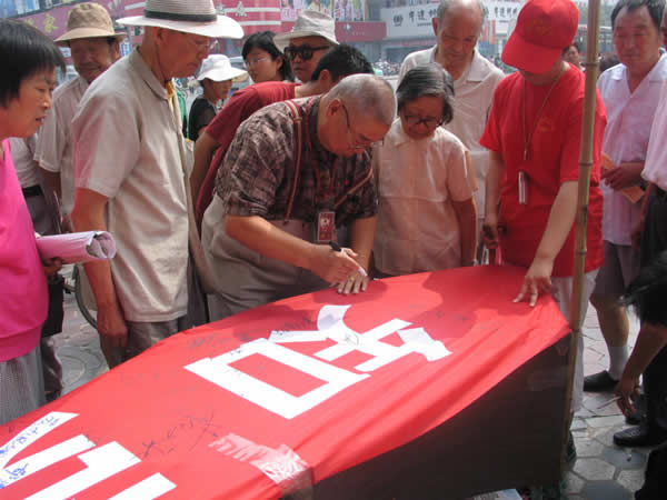 仪式结束后,与会领导率先在条幅上签名,百货大楼职工、我院学生有序地进行签名。随后,来往的行人纷纷加入了签名的行列。前来签名的市民,有公务员、教师、交警、商人、工人、大中小学生;还有年逾八旬的老人和刚刚会写自己名字的小朋友……