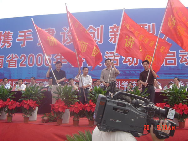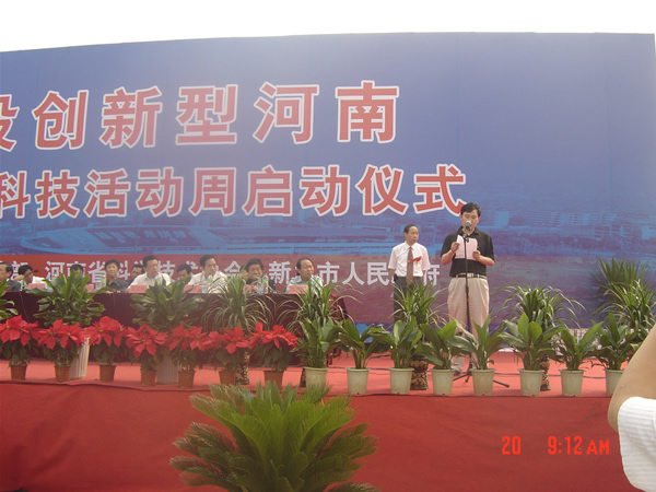 在启动仪式上,我院科研处处长王三虎代表全省广大科技工作者在启动仪式上发言,倡议科技工作者在科技创新的大潮中,要牢记人民的嘱托,勇作科技创新的排头兵,为建设“创新型河南”做出应有的贡献。会上进行了隆重的授旗仪式,我院作为“省科普传播工程讲师团” 豫北片联系单位,从省厅领导手中接过了“河南省科普传播工程讲师团”旗帜。仪式结束后,在新乡市党政领导陪同下,省领导参观了以我院为科技依托单位的“省科普传播工程示范点”建设项目。