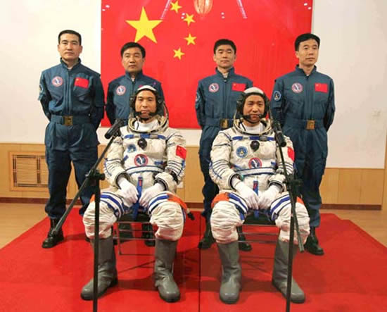 10月12日5时10分,执行神舟六号载人航天飞行任务的航天员乘组在酒泉卫星发射中心航天员公寓等候出征。左是费俊龙,右是聂海胜。
