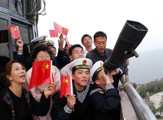 10月12日傍晚,驻守山东烟台的海军某部官兵与烟台山公园的员工一起登上49.5米高的烟台山导航灯塔,争相通过高倍望远镜观望神六遨游太空的风采。