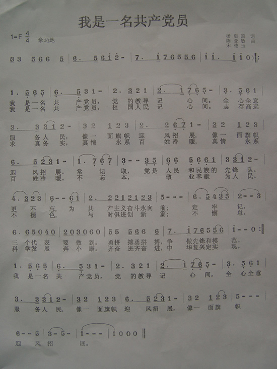 为促进保持共产党员先进性教育在我院的深入开展,我院教师扬启国作词、艺术学院音乐系教师陈亚敏、宋德玉作曲,创作了齐唱歌曲《我是一名共产党员》,歌曲激越的旋律、豪迈的气势,体现了共产党员饱满的革命热情和永往之前的英雄气魄。
