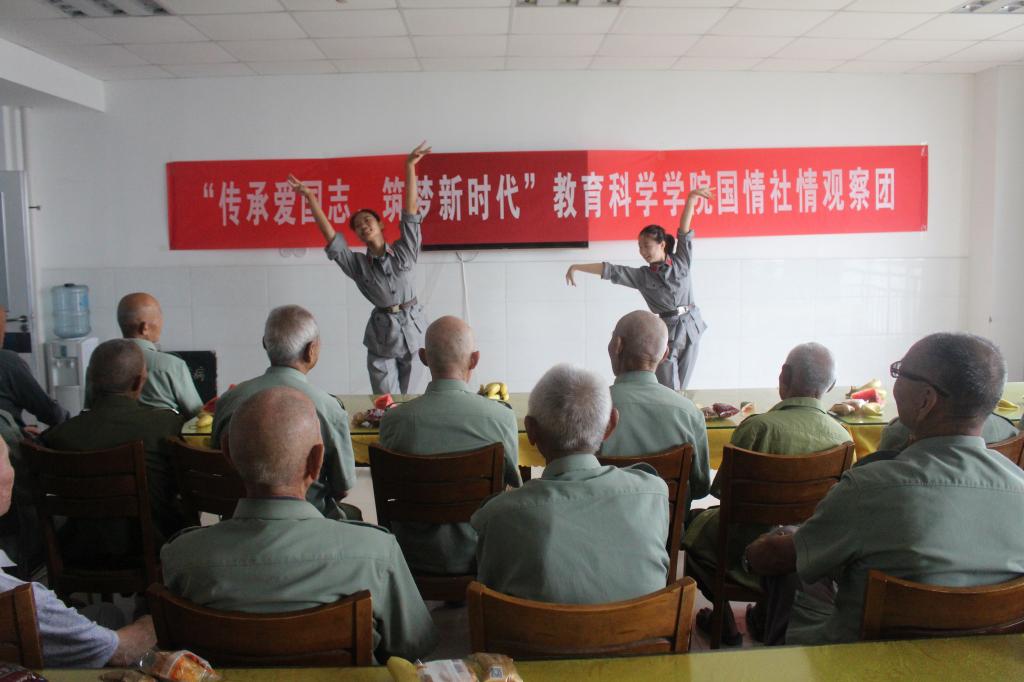在河南省荣军医院,学生党员询问了老人们的身体和生活状况,倾听老英雄们讲述难忘的红色岁月,并为他们送上了精心准备的节目。诗朗诵《和平日记》、经典歌曲《到吴起镇》,老英雄们和学生党员一起随着音乐节拍,高声歌唱,现场洋溢着浓浓的温馨气氛。