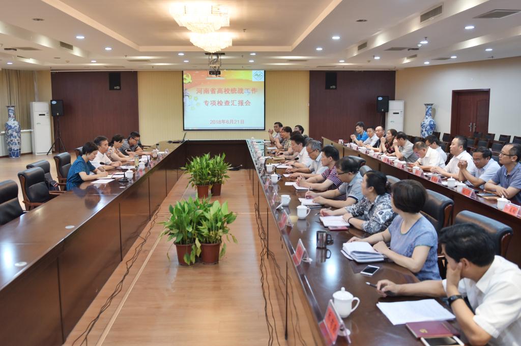6月21日上午,以郑州航空工业管理学院原党委书记梁晓夏为组长的河南省高校统战工作第三督查组莅临我校,对我校统战工作进行专项调研检查。我校在行政楼206会议室举行了专题汇报会。校党委书记周志远、党委副书记宋亚伟、副校长王霞出席会议,相关职能部门负责人、部分基层党委(党总支)书记和部分统战委员参加了会议。会议由校党委副书记宋亚伟主持。
