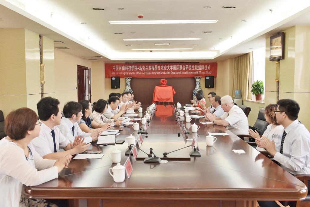 6月1日上午,我校在行政楼901会议室举行了中乌河南科技学院-苏梅国立农业大学国际联合研究生院揭牌仪式。尼古拉·索科洛夫一行3人,我校校长李成伟、副校长何松林、副校长王霞出席揭牌仪式,研究生处、国际交流处、生命科技学院、经济与管理学院、食品学院、动物科技学院、园艺园林学院、资源与环境学院等单位负责人及乌克兰项目助理参加了揭牌仪式。揭牌仪式由副校长王霞主持。