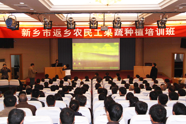 为深入贯彻十七届三中全会精神,认真落实科学发展观,切实做好返乡农民工培训和再就业工作。根据国家科技部和河南省科技厅工作安排,4月9日上午由新乡市科技局主办,我校和红旗区科技局承办的“新乡市返乡农民工果蔬种植技术培训班”在我校图书馆二楼报告厅举行。新乡市科技局李新副局长、红旗区科技局张辉局长、我校科技处王三虎处长及其它相关工作人员参会议。返乡农民工、果蔬种植专业户、生产一线的农业技术员和34名大学生村官共280余人参加了培训。会议由新乡市科技局农业科赵祥勇科长主持。